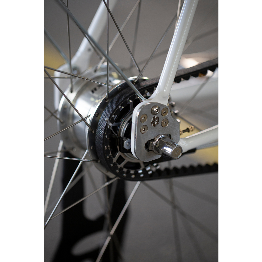 La courroie Gates® associée au moyeu à vitesses intégré Sturmey-Archer® offre une transmission silencieuse, protégée des intempéries et quasi sans entretien. Résultat : moins de contraintes au quotidien, plus de fiabilité et une conduite fluide en ville.